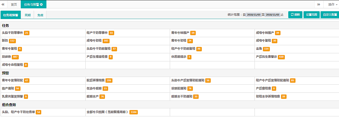 在牧場管理軟件上,管理者可以看到監(jiān)督牛場各項生產(chǎn)任務的通知和對部分管理環(huán)節(jié)的預警,例如斷奶通知、干奶通知、產(chǎn)后配種通知等。這些功能是對到期應開展的具體到牛號的工作任務提醒,以督促相關(guān)人員及時準確地執(zhí)行,避免延誤造成損失。