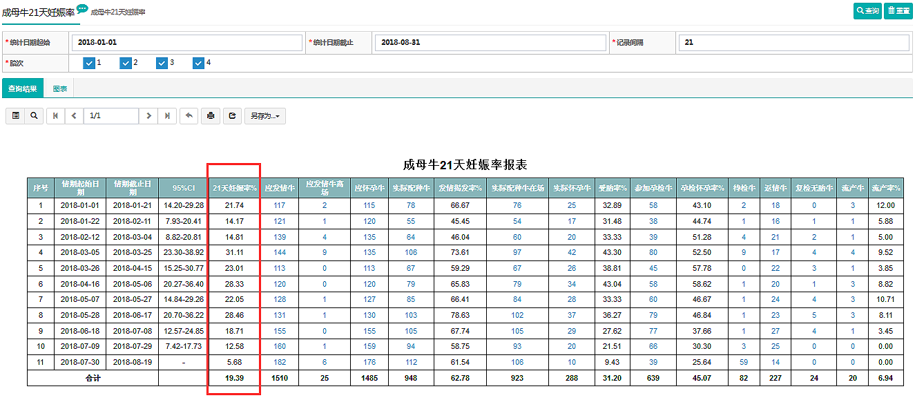 通過指標數(shù)據(jù)對關(guān)鍵管理環(huán)節(jié)加以評估和監(jiān)控,并與企業(yè)標準和行業(yè)標準進行對比,根據(jù)數(shù)據(jù)的差異可以幫助管理者及時發(fā)現(xiàn)問題,防微杜漸,以保證牧場的生產(chǎn)經(jīng)營持續(xù)、穩(wěn)定、健康地發(fā)展,如21天妊娠率的指標監(jiān)控。下圖是奶業(yè)之星?牧場管理信息系統(tǒng)對牧場21天妊娠率的監(jiān)控數(shù)據(jù)。